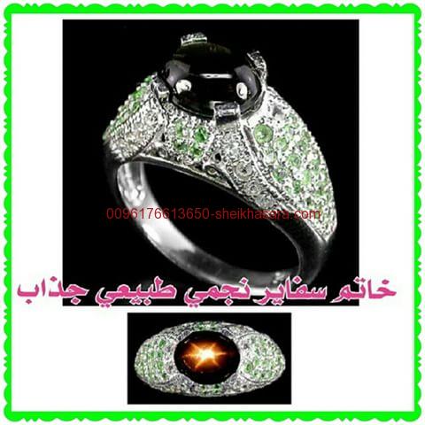 خاتم (ياقوت) سفاير نجمي (نجمة سداسية) تتلامع بالنور سفاير نجمي طبيعي نادر غير معالج مرصّع بالجارنت والتوباز الطبيعي الخاتم فضة مطلي بالذهب الأبيض ، بتصميم عجيب أهم خواص السفاير: {جلب الحكمة والسعادة والحظ الحسن وتيسير التجارة}